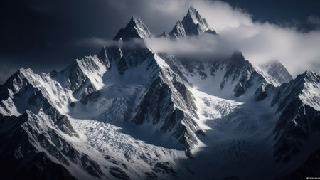 A majestic mountain range dominates the visual, covered in snow and ice. The image displays a dramatic composition, featuring a moody atmosphere with dark shadows contrasting against the bright white peaks. It might be suited for projects related to travel, nature, or environmental themes.