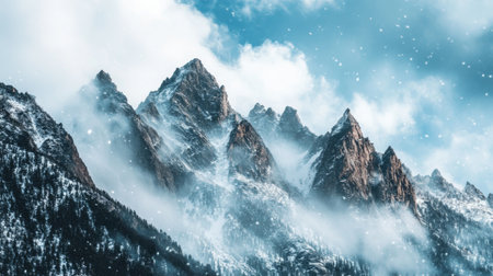 Experience the breathtaking beauty of majestic snow-capped mountains enveloped in mist and light snow, showcasing a serene and tranquil winter landscape.
