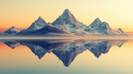 Stunning view of majestic snow-capped mountains with a mirror-like reflection on calm water at sunrise, perfect for capturing the beauty of nature and outdoor serenity.