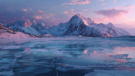 Discover a stunning frozen landscape featuring majestic snow-capped mountains and a calm icy lake that beautifully reflects the serene colors of early morning light.