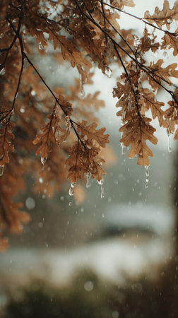 Soft rain falling gently on White oak, with water droplets forming and slowly dripping. The background is softly blurred with natural, moody atmosphere.