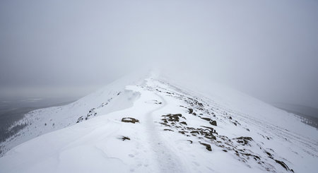 A snow-covered mountain ridge with a path leading into thick fog and mist. Clear details and vibrant colors en...