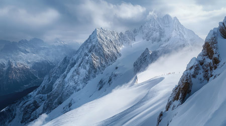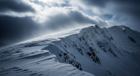 Winter showing windswept snow-covered mountain ridge with dramatic cloudy sky keywords: mountain, ridge,...