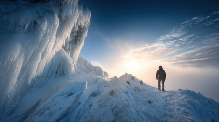 A mountain climber stands before a towering wall of ice, symbolizing challenges and obstacles in life, illuminated by dramatic light.