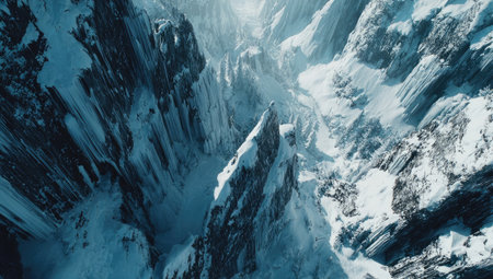 An aerial perspective showcases snow-covered mountain peaks and deep valleys. The composition features sharp, rugged textures and shades of white and blue. Bright daylight illuminates the scene, suggesting a high-altitude or arctic environment. Suitable for a variety of commercial and editorial applications.