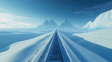 A stunning winter landscape featuring train tracks leading through a snowy terrain towards magnificent mountains under a blue sky, evoking tranquility.