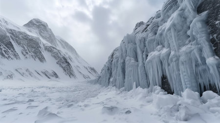 A stunning view of towering glacial peaks surrounded by a vast icy expanse. This serene and captivating landscape showcases the beauty of remote wilderness in winter.