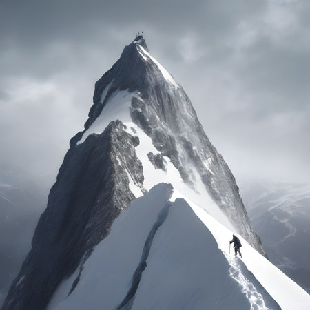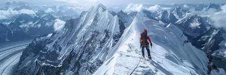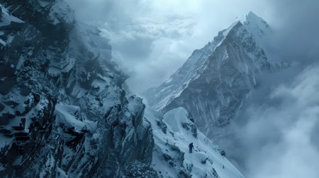 Solo mountaineer navigating a challenging snowy ridge against a foggy sky. Climber trekking icy mountain ridge through dense fog