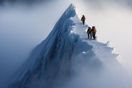Synergy fuels a groups ascent, teamwork etching paths to the lofty summit