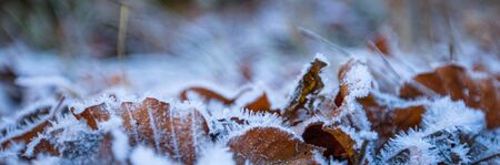 Icy freezing rain winter weather, autumn leaves covered with ice after freezing rain