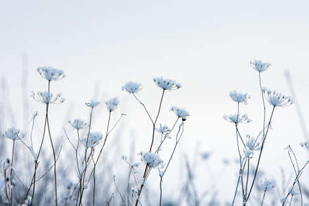 frozen icy flowers in winter frost covered wildflowers in winter field on the evening or mourning cold winter season frosty weather natural blue and white background with copy space