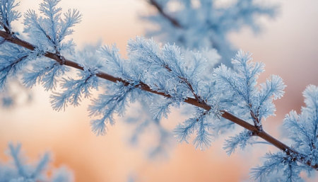 presents a soft, ethereal view of a winter branch covered in delicate ice crystals. The focus is on the intricate, feathery patterns of the frost, which appear in shades of blue and white. The background is a gentle blur of warm orange and soft blue, creating a dreamy and tranquil atmosphere. The emphasizes the subtle beauty and delicate textures of frozen nature.