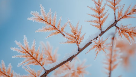 A close-up perspective reveals thin branches with small, orange, leaf-like structures, all partially covered in frost and a dusting of snow. The ice crystals are delicate and intricate, clinging to the edges of the leaves and twigs. The background is a soft, pale blue, creating a clean and serene backdrop that highlights the textures and colors of the frozen foliage. The conveys a sense of delicate winter beauty.