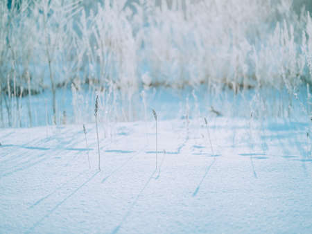 Dry grass covered with hoarfrost and snow on a clear day close-up. Winter background, blue color toning
