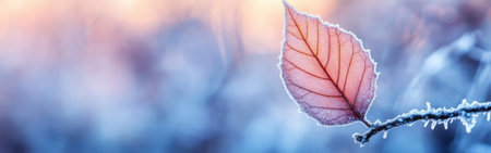 A delicate leaf, dusted with frost, stands out against a soft watercolor backdrop. The tranquil colors evoke a peaceful winter atmosphere in nature.