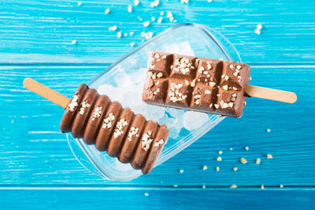 Chocolate ice creams and crushed ice on blue plate on wooden table
