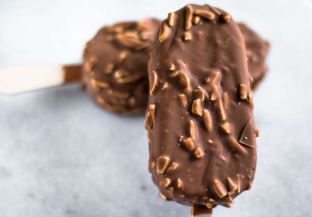 Ice cream bar vanilla covered with chocolate and nut in hand