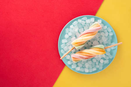 Spiral colorful ice lolly on red and yellow background