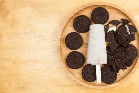 Ice cream - tasty and refreshing flavored cookies and cream, photo on wooden background.