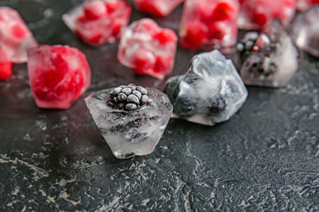 Ice with frozen berries on dark background