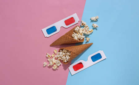 Ice cream waffle cones with popcorn, 3d glasses on pink and blue bright pastel background with deep shadow, top view. movie time. flat lay minimal composition