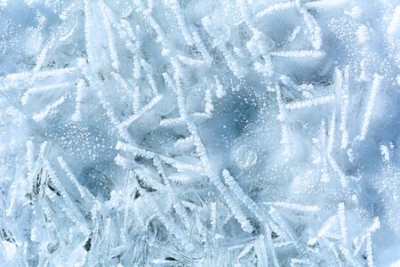 Frozen ice texture. Cold snow winter background. Blue crystal frozen abstract pattern. White frost ice texture