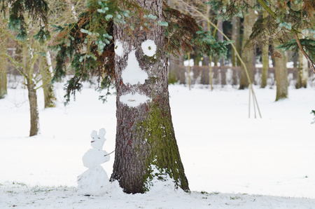 The face was made of snow on the tree.He looks into the distance.