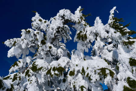 Fir tree brunches frozen and covered with hoar frost and snow against bright blue sky on a winter day. Crater lake area in Oregon. Pacific Northwest. United States of America