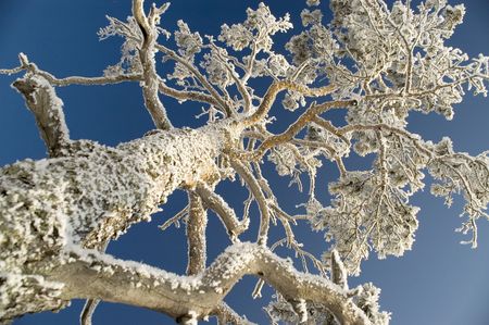 On a background of the light-blue sky a tree in snow.