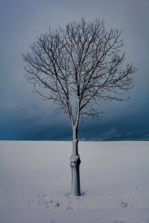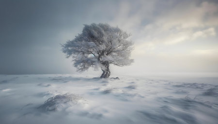 A lone, frost-covered tree stands in a vast snowy field under a cloudy sky.