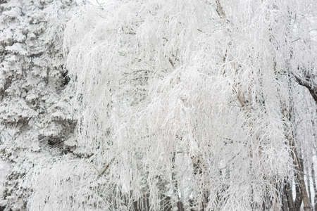 Beautiful frozen branches of trees in winter. Close up of trees in cold morning with frost.