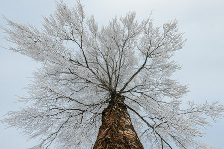 A low angle shot of a tall tree covered in snow in winter