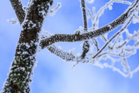 Close-up view of the tree branch in hoarfrost and snow after a blizzard. Clear blue sky. Winter wonderland. Nature, climate change, seasons, christmas, graphic resources, ecology, environment