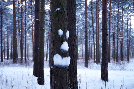 Winter landscape. Trees in the snow. Image face made snow trunk pine tree.