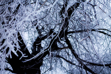 Winter morning tree branches with ice crystals, hoarfrost.