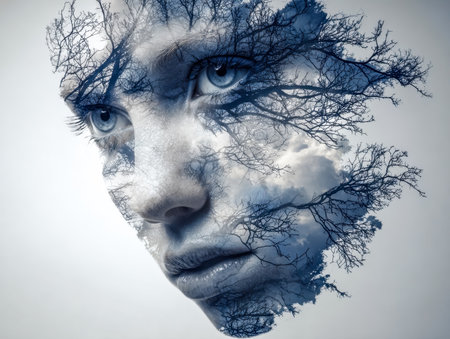 A contemplative portrait where a woman's silhouette merges with intricate, bare branches under a moody, overcast sky, evoking themes of introspection and nature's stark beauty