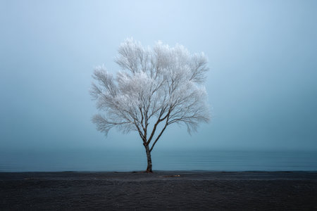 A lone tree dusted with frost emerges from rich soil, set against a hazy blue sky and tranquil waters, embodying peaceful solitude and minimalist winter beauty.