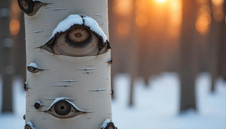 Aspen tree in winter sunlight with knot holes