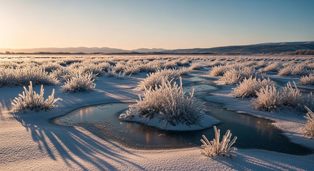 Winter showing frozen landscape with icy grass clumps and winding water channels at sunrise keywords: winter,...