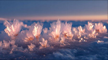 Delicate frost flowers bloom on a snowy surface, illuminated by the soft light of a winter sunrise. A serene winter scene.