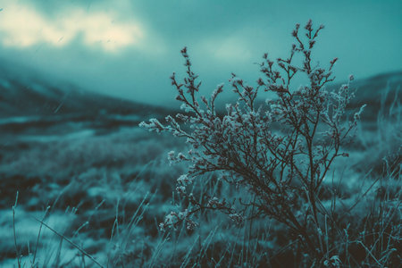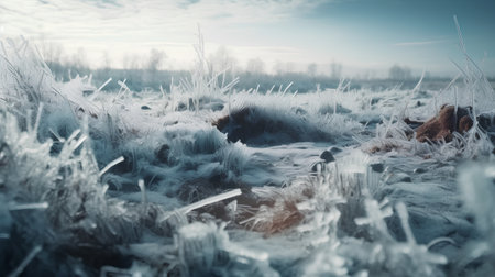 the photo showcases a frost-covered field adorned with lush grass, resembling a stunning matte painting. the captivating scottish landscapes, reminiscent of national geographic photos, are brought to life with the help of daz3d technology. the scene is further enhanced by the presence of spiky mounds, adding an intriguing element to the composition. ai generated