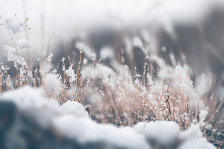 Snow-covered grass in autumn forest. Macro image, shallow depth of field. Abstract winter nature background