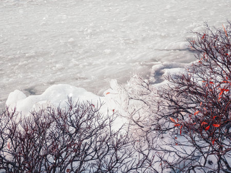 Snow blankets the rugged tundra, accented by sparse shrubs peeking through the frost.