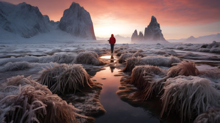 a man walks through a frozen waterfall in a snowy landscape, surrounded by ethereal seascapes and captivating documentary photos. the style of the scene is characterized by light crimson and bronze hues, showcasing richly colored skies and intricate landscapes. the organic formations and lively coastal landscapes add to the overall beauty of the photo. ai generated