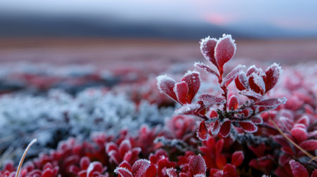 Beneath a soft blanket of snow, purple-hued plants peek through, leading to majestic snow-capped mountains in a tranquil winter tundra landscape.