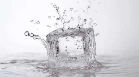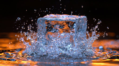 A stunning image capturing the moment an ice cube splashes into clear water, creating dynamic droplets and ripples, perfect for beverage and cooling themes.