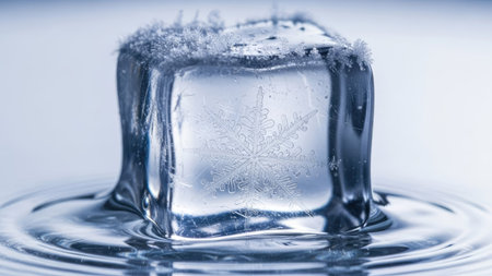 A stunning ice cube floats gracefully in clear water, embodying refreshment and tranquility. Perfect for summer themes, relaxation, and natural serenity in design.
