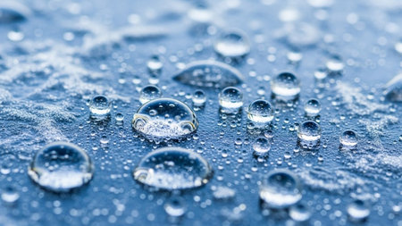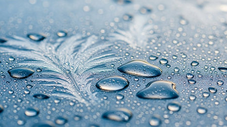 Macro view of water droplets and intricate frost patterns on a textured blue surface, showcasing the beauty of cold and moisture.