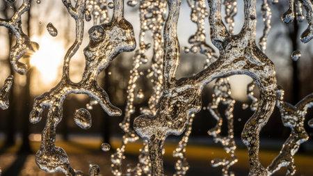 Water droplets freeze in mid-air as they splash on a frozen surface in an open area surrounded by trees during sunset hours.