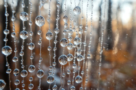 Nature's beaded curtain: raindrops on glass capturing autumn forest reflections.